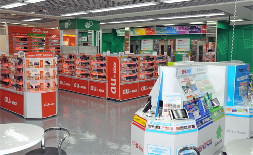「LABI1 池袋モバイルドリーム館」の地下1階には、携帯電話の総合フロアを設置し、各キャリアの端末などを扱うセクションや、携帯電話アクセサリの売り場などを設けた。また、1階はソフトバンクモバイル専用フロアとし、iPhoneをはじめとする同社製品のみを販売。iPhoneのアプリケーションを体験できるコーナーや、最新機種を紹介するコーナーを用意した。