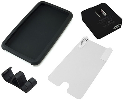 シリコンジャケットに加え、ACアダプタ、本体表面保護フィルム、動画視聴用の横置きスタンドをセットにしたパッケージ。ジャケットを装着した状態でもPCとの接続や各種操作が可能。