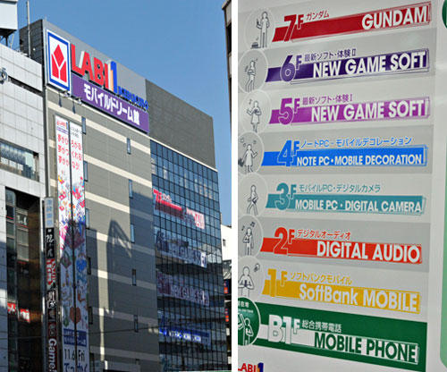 「LABI(ラビ)1 池袋モバイルドリーム館」は、地下1階から地上7階で約3500平方メートルの売り場面積に、携帯電話、携帯オーディオ、ノートPCなどモバイル製品を中心に取り揃える。そのほか、「Wii」「DS」「PSP」「PS3」「XBOX」などの各種ゲームソフト売り場、さらに、フィギュアやプラモデルなどガンダムグッズを取り扱う専門フロアも設けた。