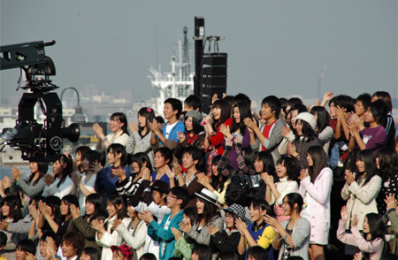 赤レンガ倉庫の建物と横浜の港湾に挟まれた会場で、真っ赤の上着を着た新垣さんと中高生たちが仲良く熱唱する。撮影シーンの間のトークタイムで、新垣さんは「こんなに人が多いと思わなかった。感動して、泣きそうになった」と、少しはにかみながら感想を述べると、中高生たちが「ガッキー、かわいいー」と愛情を込めて大声で返す。