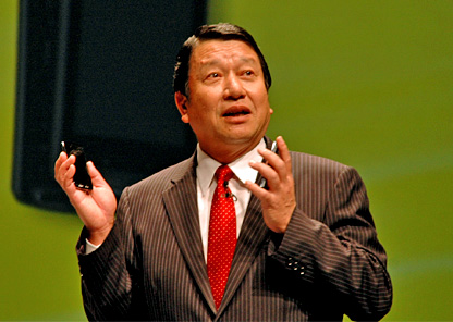 発表会の冒頭で山田隆持社長は、「見た目のデザインだけでなく、臭覚や素材の感触まで楽しめる09年度の冬春モデルは、感性に響く」と新モデルをアピール。その上、新機種の目玉となる「PRIME」シリーズの「F-04B」を報道陣に披露した。