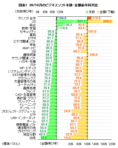 2009年10月のビジネスソフトは、Windows 7発売が大きく影響し、本数、金額ともに前年を上回った。特に、OSソフト全体の販売本数は、Windows Vistaが発売された時期と比較しておよそ2倍まで伸び、盛り上がりを見せている。