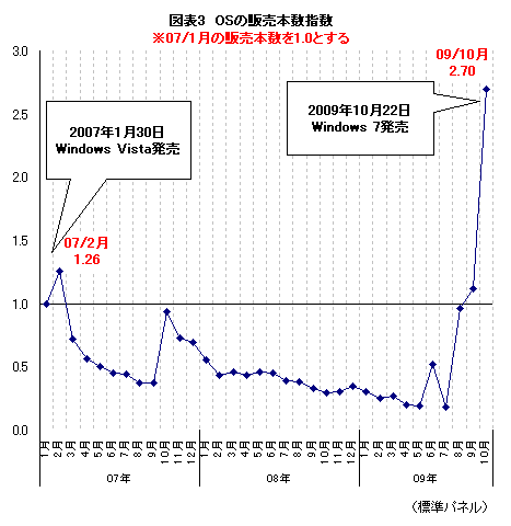 「Windows 7」は、機能の改善や基本機能の強化によって、Vista発売時以上の好調な滑り出しを見せた。Vistaが発売された07年1月のOSソフト販売本数を1.0とすると、09年10月はその2.7倍、07年2月と比較しても2.1倍とほぼ倍の水準(図表3)。Windows 7の発売効果は大きい。さらに、PCやPCパーツなど周辺ジャンルへの影響も予想される。11月以降もどこまで好調を継続できるかが焦点だ。(BCN・岩渕恵)