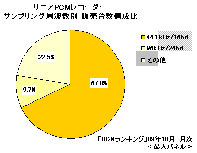 10月現在、リニアPCMレコーダーの主流は「44.1kHz/16bit」で販売台数の67.8%を占めている。その一方で、「96kHz/24bit」対応モデルは9.7%と少ないものの、一定の存在感を示している。この秋、「96kHz/24bit」対応の高機能モデルに新製品が加わったことで選択肢が豊富になり、より好みに合った機種をセレクトしやすくなりそうだ。(BCN・井上真希子)