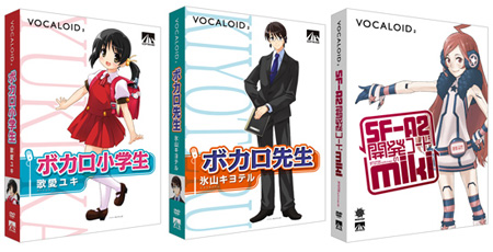 (左から)「VOCALOID2 歌愛ユキ」「VOCALOID2 氷山キョテル」「VOCALOID2 SF-A2 開発コード miki」
