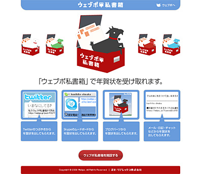 「ウェブポ私書箱」は、ブログパーツやURLをブログなどに貼り付ければ、「ウェブポ」を利用して年賀状を受け取ることができるサービス。ブログパーツやURLは、TwitterやSNSの日記、Skypeなど、各種サービスのムードメッセージにも添付できる。ブログパーツやURLの取得は無料。