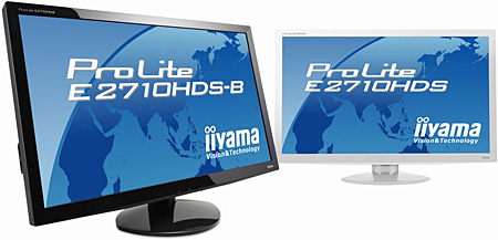 マウスコンピューターは11月24日、PCやディスプレイのブランド「iiyama」から、解像度1920×1080ピクセルのフルHD表示が可能な27型ワイド液晶ディスプレイを12月中旬に発売すると発表した。価格はオープンで、ネットショップ「iiyama e-shop」での価格は3万7800円。ラインアップは、ピュアホワイトの「E2710HDS」とマーベルブラックの「E2710HDS-B」の2モデル。