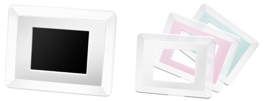 「GHV-DF35CW」はクリアフレームを採用し、ホワイト、ミントブルー、パステルピンクの3色の着せ替え用フレームをセット。インテリアや気分に合わせてフレームを着せ替えできる。スタンドは縦置き・横置きに対応し、フレームの壁掛けも可能。機能面では、時間調節ができるスライドショー表示や、カレンダー・時計の表示ができる。