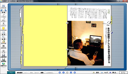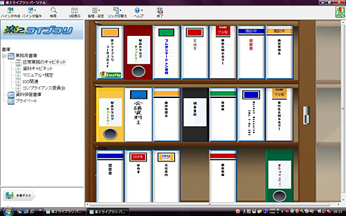 データ管理ソフト「楽2 ライブラリパーソナル」を使えば、スキャンした電子データを実際のリングファイルに綴じていくかのように保存・管理することができる。日常的に使い慣れた文具を模したインターフェースなので、PCの苦手な人でも直感的に管理・操作できる。
