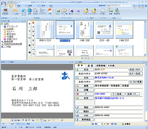 毎日のように人と接する営業マンの多くが、貯まっていく名刺の管理に手を焼いていることだろう。そんな名刺管理の煩わしさも、付属の「名刺ファイリングOCR」を使えば一発解決。業界トップレベルの名刺認識率を誇るOCR機能で名刺情報をテキスト化し、データベースで管理できる。会社名や氏名、所属、電話番号、メールアドレスから、瞬時に目的の人物をピックアップすることが可能だ。
