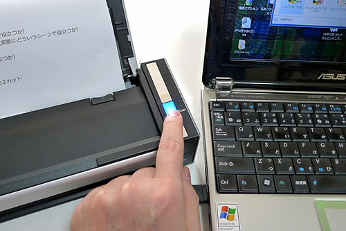 では、実際に「ScanSnap S1300」を使ってみよう。データを取り込むのは至って簡単。読み取る書類を本機にセットし、本体横のScanボタンを押すだけだ。