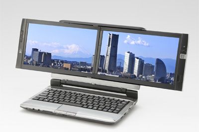 解像度1024×600ピクセルの10.1型ワイド液晶ディスプレイを、上下に重ねたかたちで2基搭載。通常は1基のディスプレイを使用するが、重なった部分を左右にスライドすれば、2枚のディスプレイを並べて最大2048×600ピクセルの表示領域を確保できる。ブラウザや複数のアプリケーション、横長の表計算シートなどを、画面をまたいで展開することで、作業効率が高められるという。