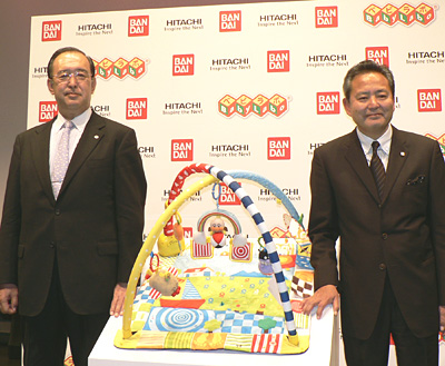 脳科学から生まれた乳児玩具を紹介する日立製作所の長野晄史執行役常務とバンダイの上野和典社長(右)