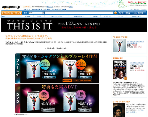 アマゾンジャパンは12月2日、オンラインストア「Amazon.co.jp」で11月30日から予約を受け付けている『マイケル・ジャクソン THIS IS IT』のDVDとブルーレイ商品の初日予約数が、「Amazon.co.jp」の全商品の初日予約注文数として過去最高となる3万枚を記録したと発表した。