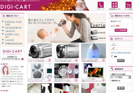 同社によると、「DIGI-CART」では女性の目線を意識したワンランク上の商品を揃え、女性を主なターゲット層にする。取扱商品は、ビデオカメラやオーディオ、デジタルフォトフレームなどのAV機器のほか、インフルエンザ対策キットや空気清浄機などの健康商品、時計や革製品など銀座天賞堂オリジナルグッズ、ペット関連製品などと幅広い。