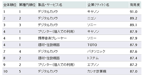 アクセス経験のあるサポートサイトについて利用時の有用度を5段階でたずね、「とても役に立つ」「まあ役に立つ」と回答した人の割合をランキングにした。2位はニコンで89.2%、3位はソニーで89.1%、いずれも製品・サービスのジャンルはデジタルカメラだった。4位はキヤノンのプリンタ(個人利用)、ソニーの携帯音楽プレーヤー、TOTOの建材・住設機器で、87.9%で並んだ。
