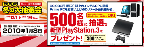 キャンペーンの対象となるのは、期間中にインテル製CPUを搭載した税込9万9980円以上の「Prime PC」を購入したDJメール会員。特賞として、抽選で500名に9月発売の新型「プレイステーション 3(CECH-2000A)」をプレゼントする。抽選に漏れたユーザーには、全員にポイント賞として「300 DJポイント」をプレゼントする。