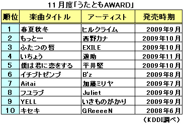 KDDIとレーベルゲートは12月8日、音楽配信サービス「LISMO」の機能として協業で提供する音楽コミュニケーションサービス「うたとも」のサイトで、au携帯電話でよく聴かれた「着うたフル」を表彰する11月度の「うたともAWARD」を発表した。