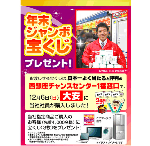 今回のキャンペーンは、実施店舗4店のいずれかで、同社が指定する薄型テレビ、冷蔵庫、洗濯機、パソコン本体を購入した先着合計4000名に、年末ジャンボ宝くじを3枚プレゼントするもの。