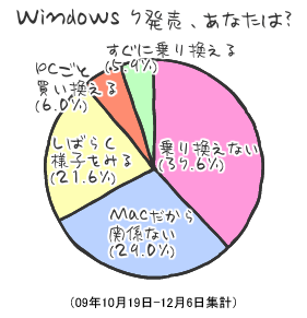 2位は「Macだから関係ない」で29.0%。Macユーザーが約3割いらっしゃるのですね、うちの読者には。1位と2位を合計すると、Windows 7を購入しないという人が60%を超えます。