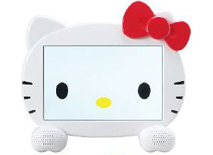 キティの顔の中央部に画面をはめこんだ液晶テレビ。台座は足、リモコンはリボンの形だ。リモコンの「kittyボタン」を押すと、約1分間、ハローキティの目と鼻を画面に表示し、テレビ全体でハローキティになる。