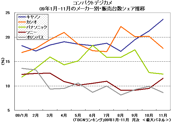 同社は、1回のフル充電で1000枚撮影できるモデルや動く合成写真を作成できるモデル、ハイスピードムービーを撮影できるモデルなど、個性的な製品を揃え、1月-10月までの総合計でトップを獲得。10月と11月の単月でキヤノンが盛り返し、1月-11月の合計では1位を奪われたが、キヤノン19.0%、カシオ計算機18.9%と、その差はわずか0.1%。どちらが今年のコンパクトデジカメ市場を制するのか、年末まで目が離せない。(BCN・武井美野里)