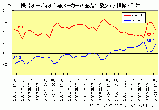 やや長いレンジでみても、両社の販売台数シェアはかなり接近してきている。3年前の06年11月の月次シェアでは、アップルが52.1%だったのに対し、ソニーは20.3%。30ポイント以上の大差がついていた。09年11月はアップルは52.2%とほとんど変わらないのに比べ、ソニーは38.6%。その差は10ポイント台まで詰まってきているのだ。