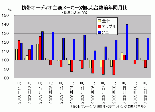 事実、携帯オーディオの販売台数前年同月比をみると、2月にキャンペーンが始まったとたん、それまで前年同月比で20%前後は拡大していたiPodは前年割れに転じている。6月にiPhone 3GSの発売もあって、携帯オーディオの販売台数前年割れは徐々に拡大。8月には16.4%減を記録した。翌9月は新製品発売で前年を上回る販売台数を記録したものの、10月、11月と再び前年割れ水準に戻ってしまった。