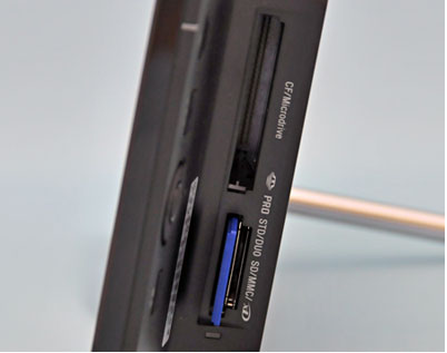 一方、メモリカードの場合は、本体のスロットにカードを挿入するだけ。利用できるメモリカードの種類は豊富で、SDカードやメモリースティック、コンパクトフラッシュなど、一般的なデジタルカメラで利用可能なメモリカードなら、ほぼ対応している。