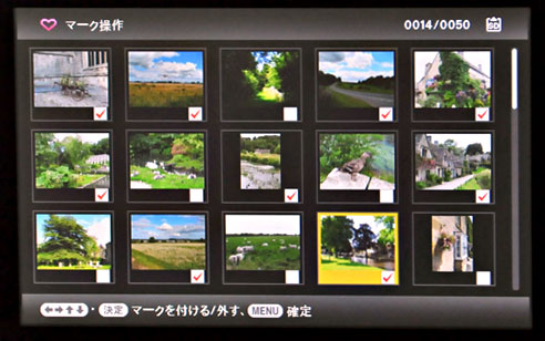 写真の絞り込み機能も、ぜひ活用したい。例えば、フォルダ指定機能。この機能を利用することで、メモリカード内の特定のフォルダだけを表示することができる。子どもの成長記録や結婚式など、見たい、あるいは見せたい写真だけを映しておくことができるのだ。また、手動での絞り込みも簡単。お気に入りの写真にマークを付けて、登録した写真だけを再生できる。