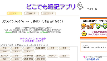 サイトには、「趣味」「資格」「学校」の三つの分野で、教養やビジネス、語学など、さまざまなコーナーを設けた。コーナーごとに、ほかのユーザーが登録したアプリを選んだり、自分で勉強するための新規アプリを作成し、QRコードで携帯電話に送ることができる。通勤・通学時、携帯電話が暗記帳になるわけだ。