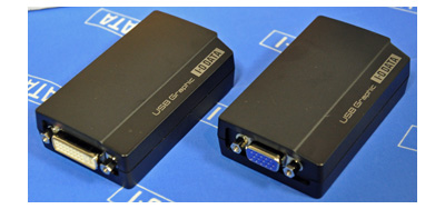 上位モデル「USB-RGB/D2」は、解像度QWXGA(2048×1152)まで対応したのに加え、基板にDual Coreチップを採用することでPCのCPUの負荷を抑え、スムーズに映像を表示することができる。なお、出力端子はDVI-I 29ピンだが、付属のアダプタを使うことでD-Sub 15ピンにも対応する。