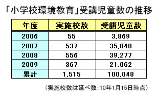 「小学校環境教育」は、地球環境を思いやる心を育むことによって、子供たちが環境を意識した生活習慣を身につけることを目的にしたプロジェクト。06年10月に全国で開始し、10年1月現在で受講児童数は累計10万人、実施校数が延べ1500校を超えている。