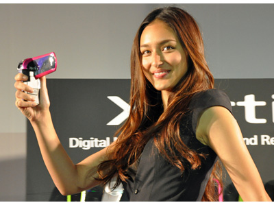 「Xacti」のイメージキャラクター、モデルの長谷川潤さんは「DMX-CS1」について、「デザインがかっこよく、色がかわいい。そのバランスが好き」と感想を述べた。また、「どのように使いたいですか」という司会者の質問には「家族や友達など、身近な思い出を撮っていきたい」と日常生活での利用シーンを提案した。
