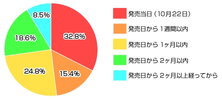 購入した時期でもっとも多かったのは「発売当日」で、全体の3分の1。Windows 7への無料アップグレード権付きのパソコンを購入していたユーザーが多く含まれるとみられる。以下、「発売から1か月以内」24.8%、「発売から2か月以内」18.6%、「発売から1週間以内」15.4%と続く。