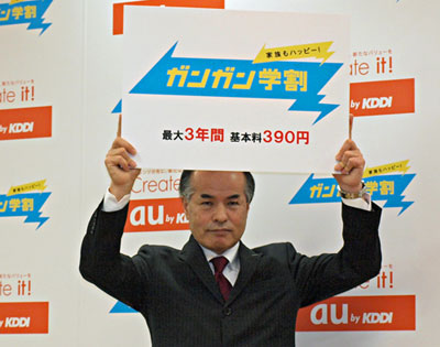 KDDIは、学生とその家族の新規契約者を対象に、au携帯電話の基本使用料を最大3年間割り引くキャンペーン「ガンガン学割」の申し込みを、2010年2月9日-5月9日の期間で受け付ける。