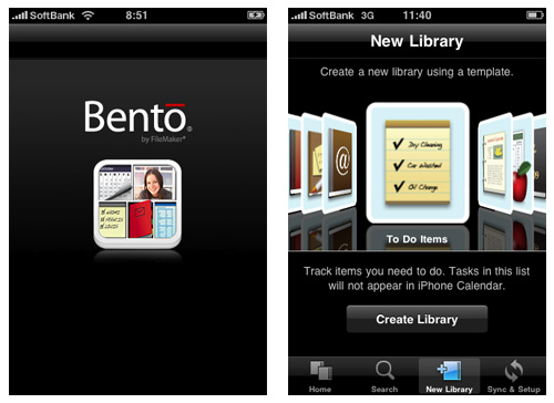 iPhone版Bentoは、作業画面が「Home」と「Search」「New Library」、そして「Sync&Setup」の4種類に分かれている。Homeは作業対象とするデータベースの選択と概要の表示、Searchは全データベースを対象とした文字列の検索を行う。New Libraryは新規ライブラリの作成、Sync&Setupは同期に関する設定・実行のときに利用する。