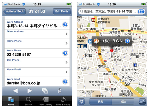 このほか、iPhoneアプリの住所やメールアドレスとも連携。住所欄では、Googleマップのサービスを利用した「マップ」が起動して地図が現れる。また、メールアドレスでは、そのアドレスに宛てた新規メッセージの作成画面を表示する。