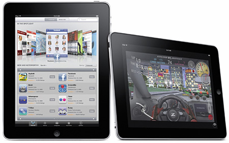 「iPad」は、マルチタッチに対応した9.7インチLEDバックライトディスプレイを搭載した新端末。入力方法は、iPhoneが採用する「インテリジェントソフトキーボード」のほか、「iPad Keyboard Dock」を介することでハードウェアキ-ボードも接続可能で、モバイル、据え置きに柔軟に対応できる。CPUには新設計の「A4チップ」を採用し、最長10時間の長時間駆動を実現。また「Adaptive Charging テクノロジー」によって、バッテリ容量を著しく減少させることなく、通常5年間の電池寿命で最大1000回の充電ができるなど、モバイル性能を重視している。
