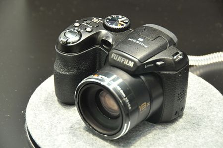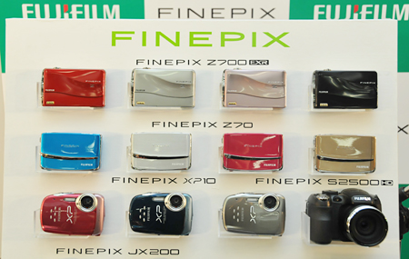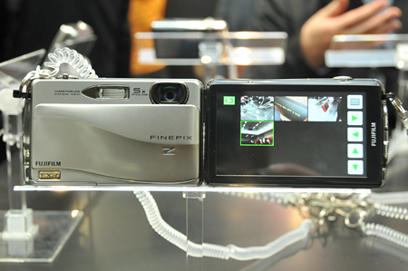 目玉となるのは「FinePix Z700EXR」。画像再生時にカメラを縦にすると、液晶ディスプレイを上面にプレビュー、下面にサムネイルの2画面に分けて画像を表示。それぞれの画面を操作できる。カメラの縦・横向きを自動で判別し、向きに合わせて画像を回転して表示することも可能。ディスプレイはタッチパネル方式の3.5型ワイド液晶で、指先で再生などの操作ができる。