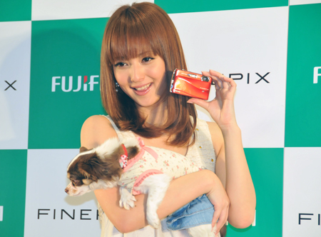 富士フイルムでは、新製品投入に合わせて、イメージキャラクターにモデルの佐々木希さんを起用し、広告やプロモーションを展開することを発表した。佐々木さんは、2日の発表会に愛犬のマロンちゃんと登場。撮影デモを行い、「犬の表情を自動で認識してくれるのはすごい機能」と、新製品をアピールした。
