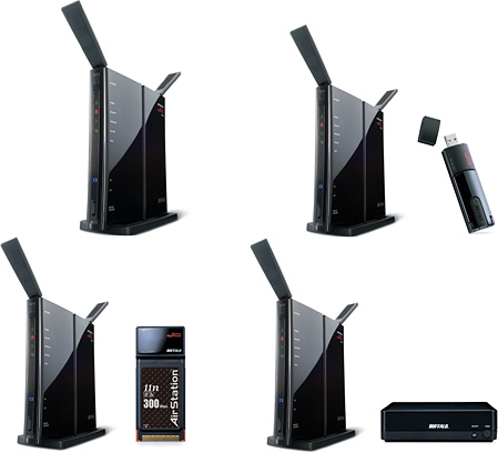価格は、無線LAN親機単体の「WZR-HP-G301NH」が1万4280円、同製品とUSB2.0用の無線LAN子機「WLI-UC-G300HP」とのセットモデル「WZR-HP-G301NH/U」、CardBus接続の無線LAN子機「WLI-CB-G300HP」とのセットモデル「WZR-HP-G301NH/P」がともに1万8690円、有線LANを4ポート搭載したLAN単子用の無線LAN子機「WLI-TX4-AG300N」とのセットモデル「WZR-HP-G301NH/E」が2万3205円。発売時期はLAN端子子機セットのみ3月下旬で、それ以外の3製品は3月上旬の予定。