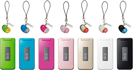グリーン、ブルー、ビビッドピンク、ピンク、ゴールド、ホワイト、ブラックの7色を揃えた「ポップカジュアルケータイ」。今回、本体購入の特典として、本体と同色の「Jelly Beansフィギュアストラップ」が数量限定で付属する。