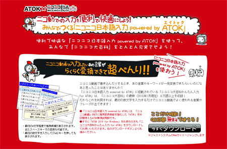 「ニコニコ日本語入力 powered by ATOK」は、通常の「ATOK無料試用版」に、「ニコニコ動画」のユーザーが編纂したオンライン百科事典「ニコニコ大百科」の登録語句から8万語以上を変換辞書と省入力データとして収録したもので、90日間無料で試用できる。
