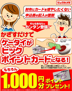 現在実施中の「ビックポイントカード新規申込みキャンペーン」では、新たにポイントカードを申し込んだ人に、もれなく1000ポイント(1000円分)をプレゼントする。