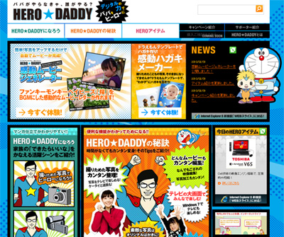 「HERO★DADDY」キャンペーンは、「仕事が忙しい」「家族とコミュニケーションがとれていない」などの悩みをもつパパが、家族の頼れる“ヒーロー”になれるよう応援するキャンペーン。最新のPCや周辺機器、サービスを活用して、パパが「できたらいいな」と思うことが実現するように、専用のWebサイトで情報提供するもの。2009年11月から展開している。