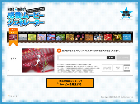今回公開した「感動ムービージェネレーター」は、あらかじめ用意された映像テンプレートに沿って、家族の写真をWeb上にアップロードすれば、オリジナルムービーが作成できるもの。BGMには人気グループ「FUNKY MONKEY BABYS(ファンキーモンキーベイビーズ)」の「桜」を起用し、映像の最後にコメントを入れることもできる。