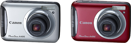 「PowerShot A495」は、電源に単3形乾電池2本を使用するエントリーモデル。旅先などで電池がなくなったとき、手軽に電源が調達できる。「ぴったりフラッシュ」機能を備え撮影をサポートする。有効約1000万画素の1/2.3型CCDイメージセンサー、35mmフィルムカメラ換算で37-122mm相当の光学3.3倍ズームレンズを搭載する。