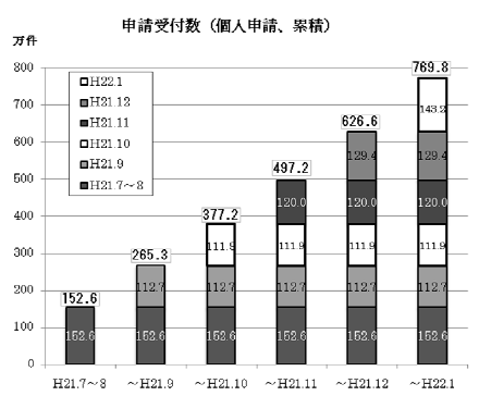 発表によると、10年1月の個人による申請受付数は約143万件で、これまでのペースを上回る件数となった。09年7月から10年1月までの申請受付数は769万8415件。また、エアコン・冷蔵庫・テレビを合わせたエコポイント発行件数は累計689万1200件、エコポイント発行点数は累計1071億8849万5000点となり、1000億点を超えた。