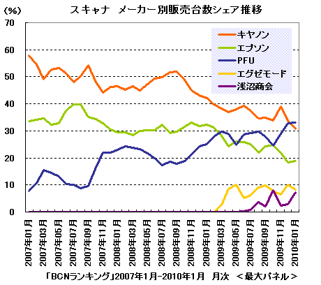 2010年1月、PFUがスキャナのメーカー首位に躍り出た。販売台数シェアは33.2%。「BCNランキング」06年8月以降、3年5か月ぶりのトップ交代となる。大量の紙を一度に読み取るのに適した「シートフィード型」に人気が集まったためだ。一方、2位に順位を下げたキヤノンは30.6%だった。